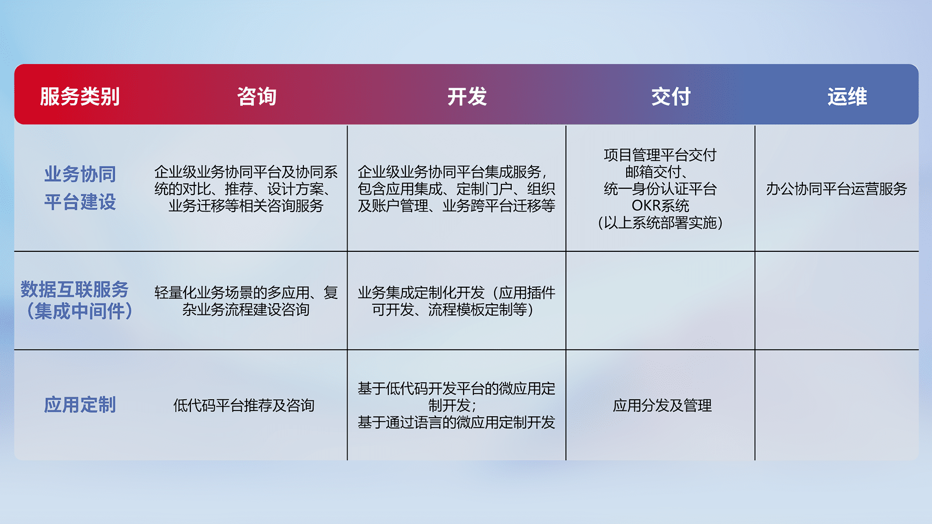 针对钉钉、、企微、、、、IDaas等平台级产品提供产品的规划、、、方案、、、交付、、、定制化开发等服务,,,,实现如统一协同办公、、智能客户服务、、、混合会议管理、、、智能数据查询、、等业务场景,,,,实现数字化转型。。。。